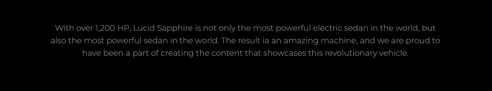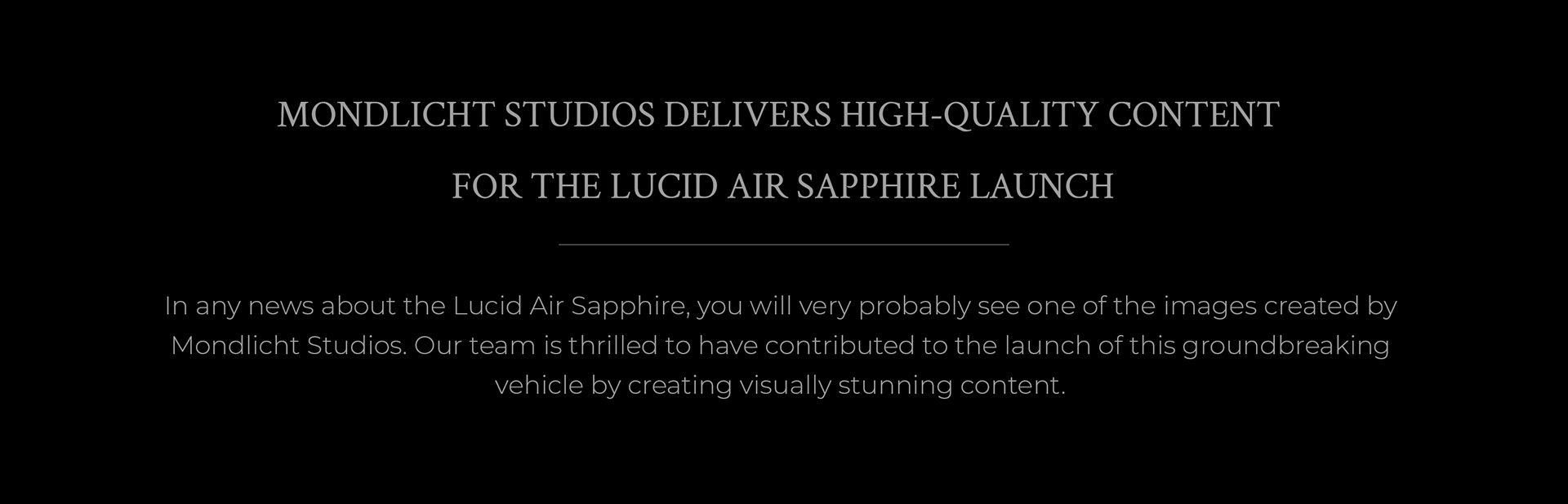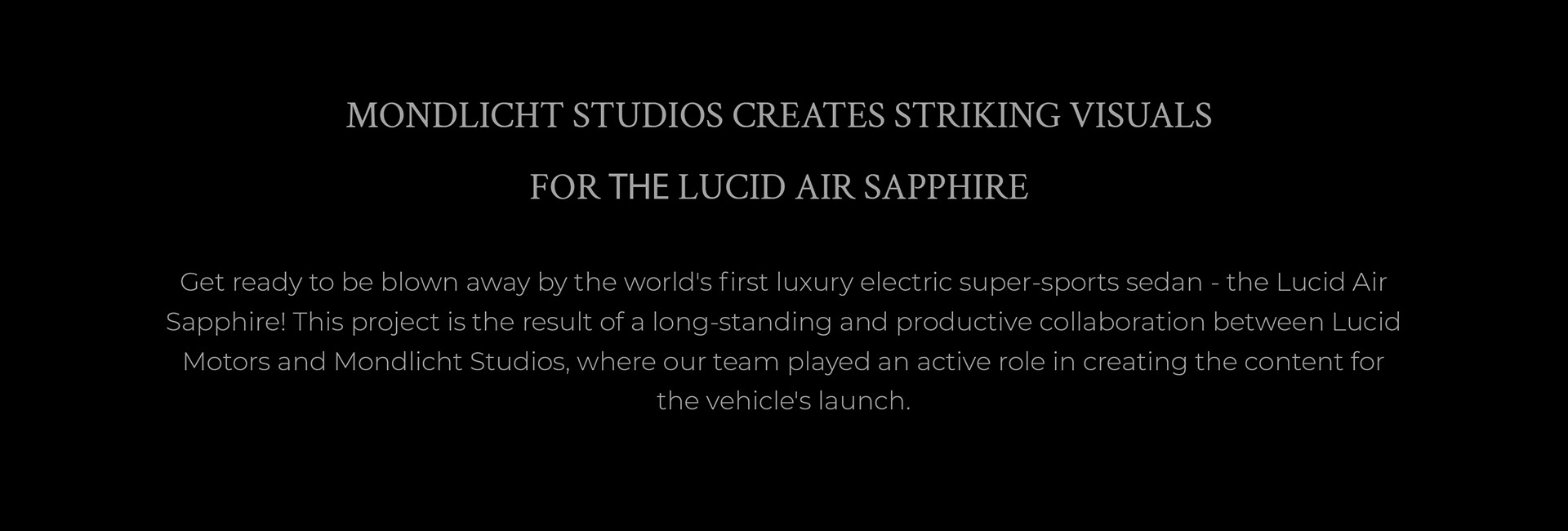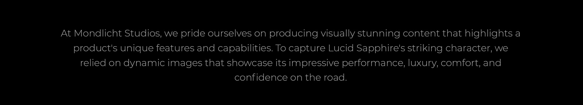 This project is the result of a long-standing and productive collaboration between Lucid Motors and Mondlicht Studios, where our team played an active role in creating the content for the vehicle's launch.