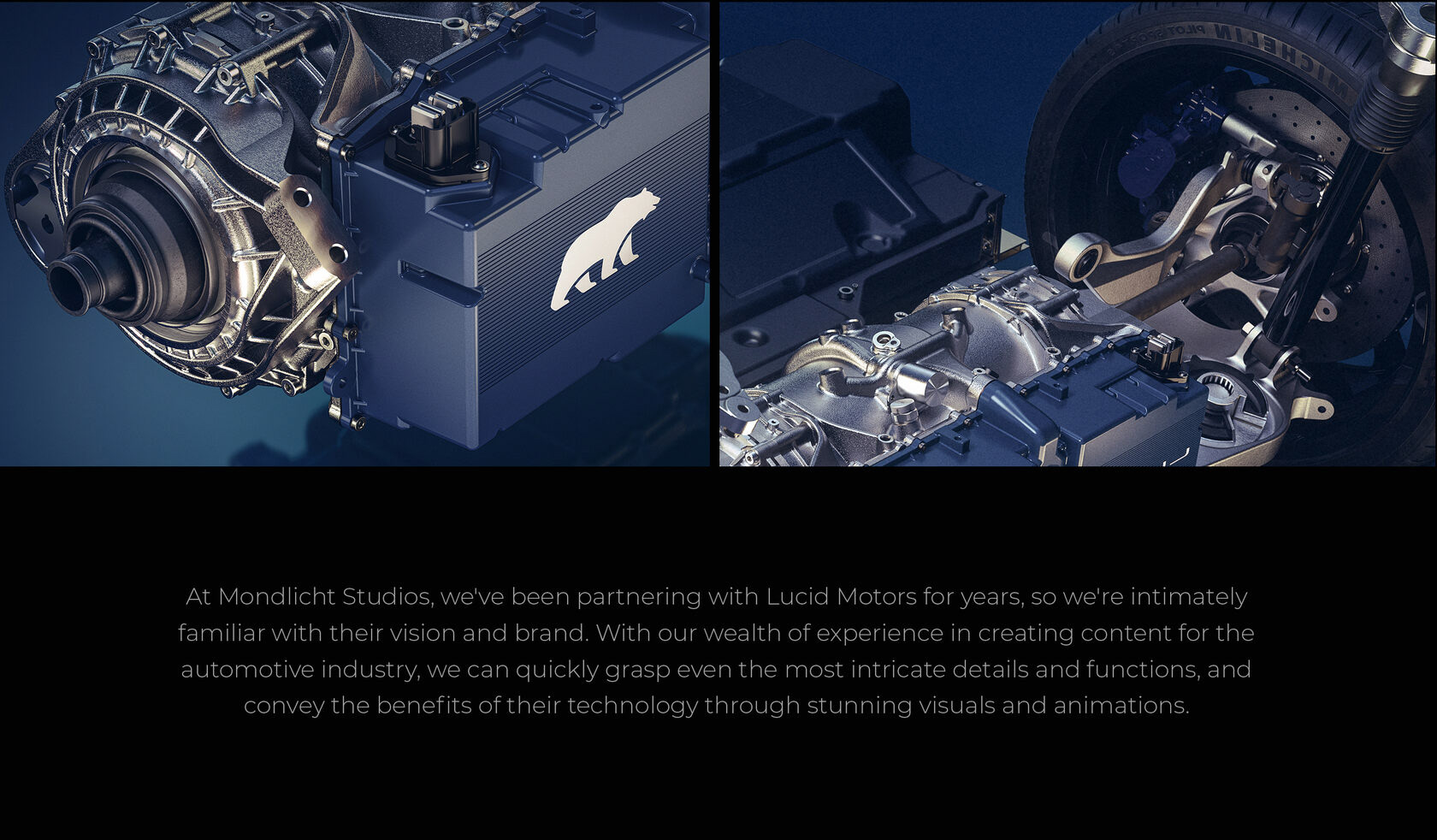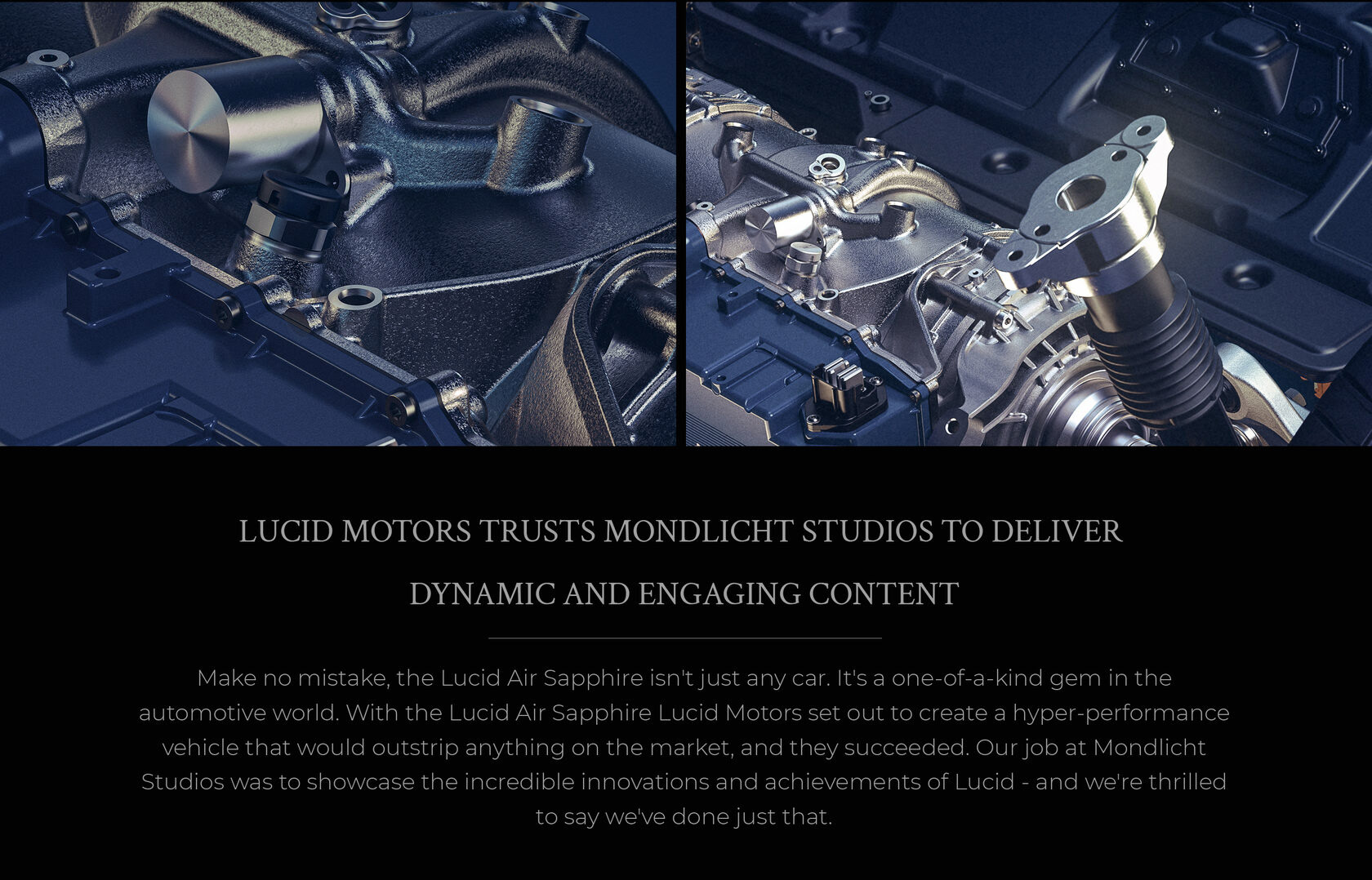 At Mondlicht Studios, we've been partnering with Lucid Motors for years, so we're intimately familiar with their vision and brand. With our wealth of experience in creating content for the automotive industry, we can quickly grasp even the most intricate details and functions, and convey the benefits of their technology through stunning visuals and animations.