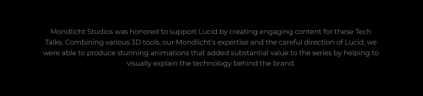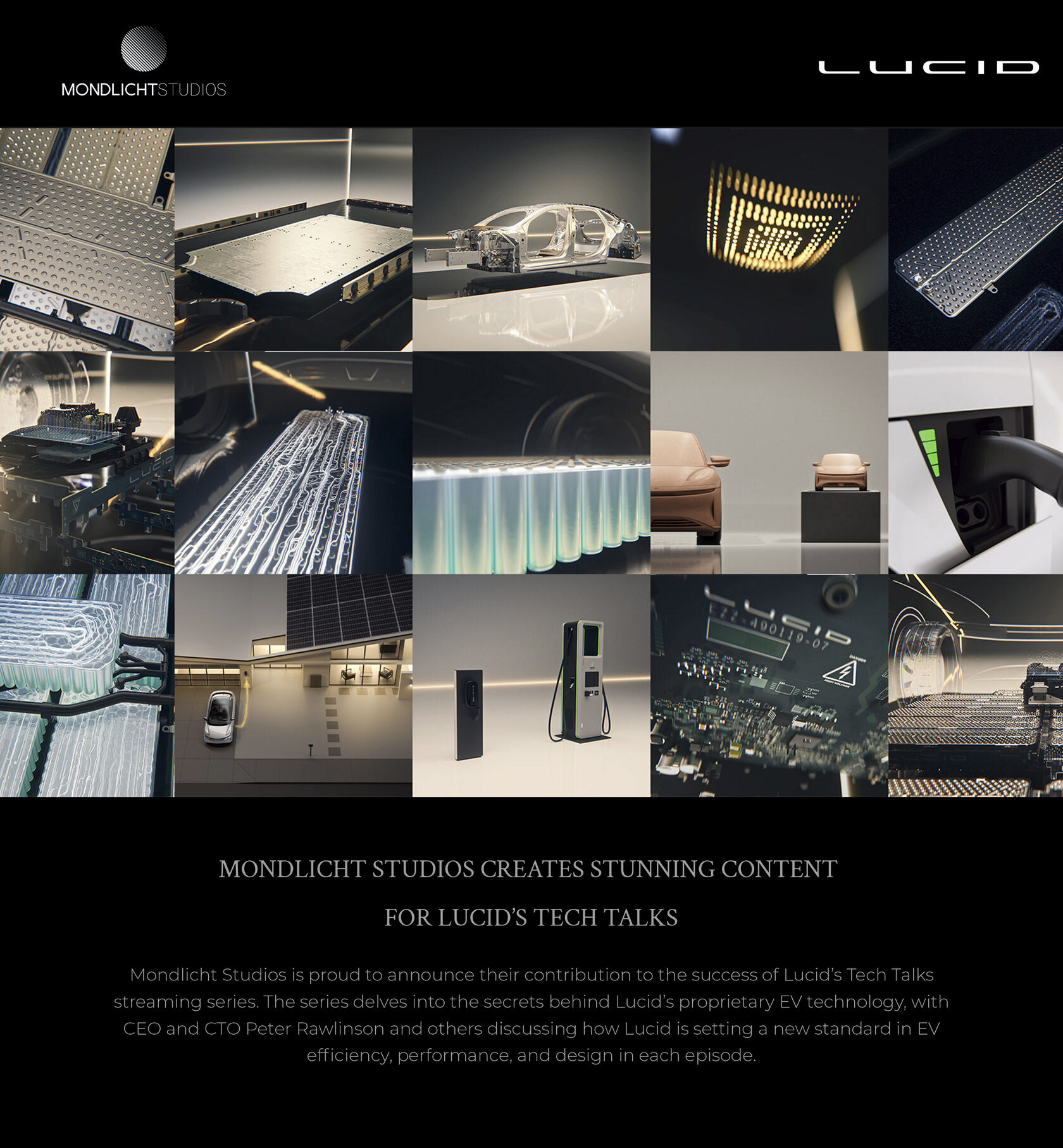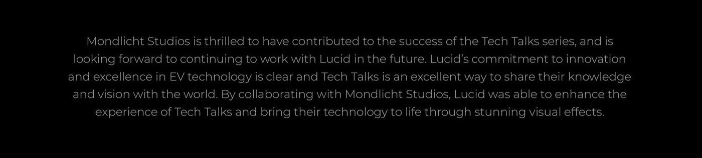 Mondlicht Studios is proud to announce their contribution to the success of Lucid’s Tech Talks streaming series. The series delves into the secrets behind Lucid’s proprietary EV technology, with CEO and CTO Peter Rawlinson and others discussing how Lucid is setting a new standard in EV efficiency, performance, and design in each episode.