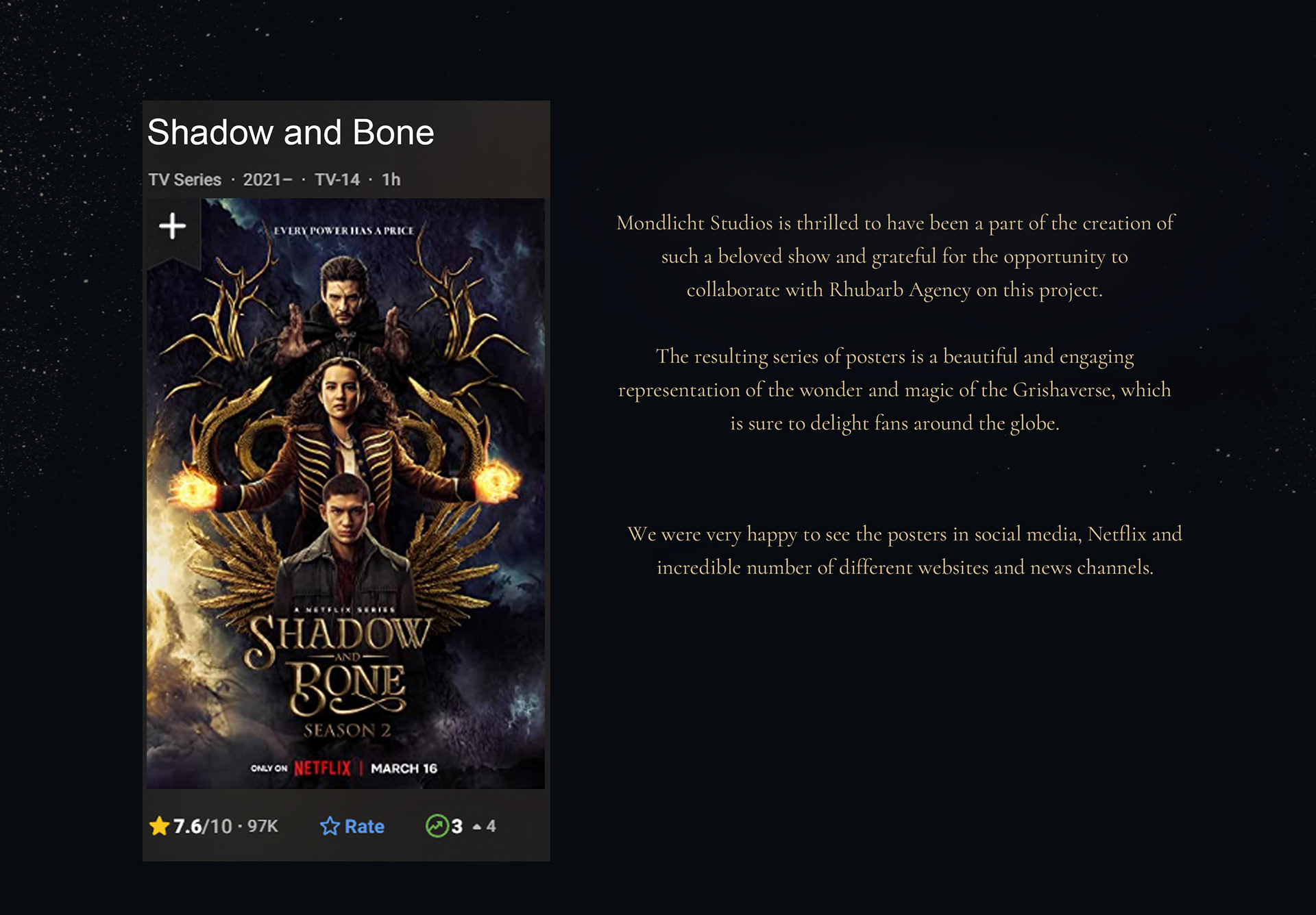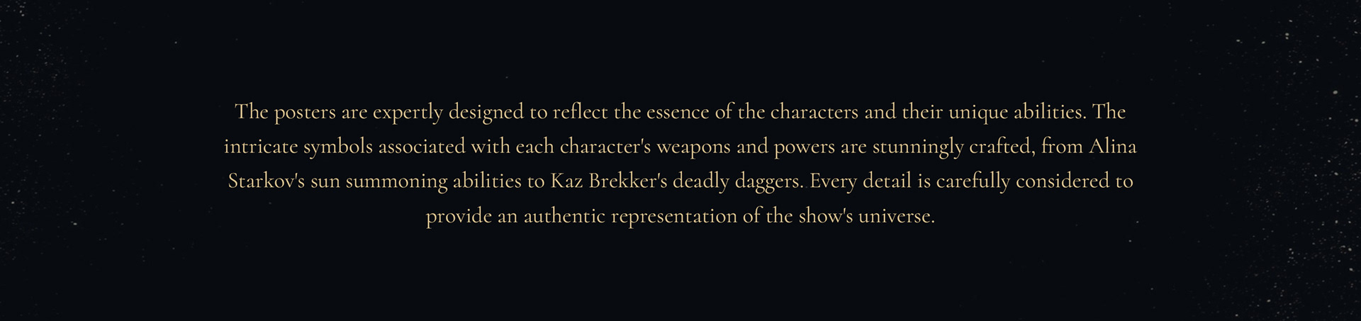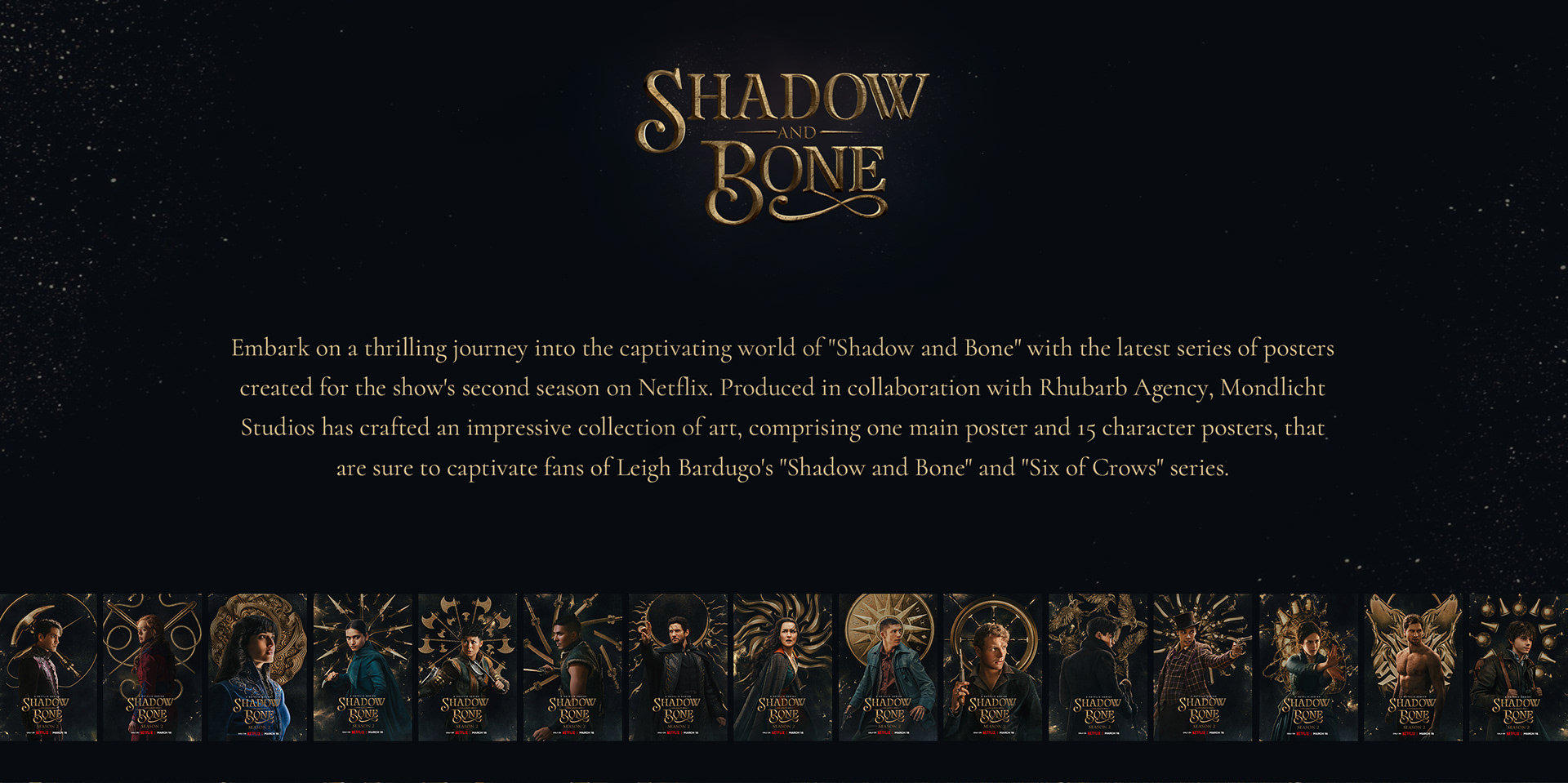 Produced in collaboration with Rhubarb Agency, Mondlicht Studios has crafted an impressive collection of art, comprising one main poster and 15 character posters, that are sure to captivate fans of Leigh Bardugo's "Shadow and Bone" and "Six of Crows" series.